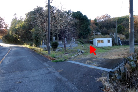 大師堂前からコンクリート舗装の道を南南西へ90m下り、変則十字路から更に南南西へ170m進む。