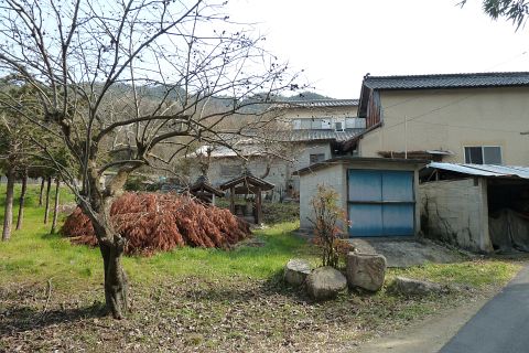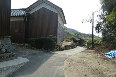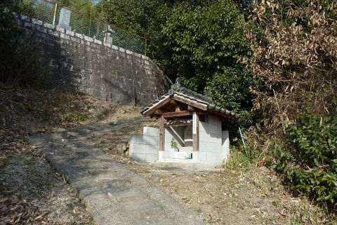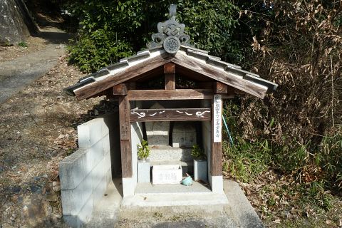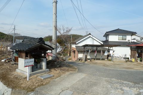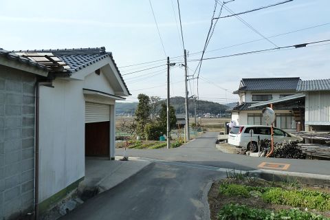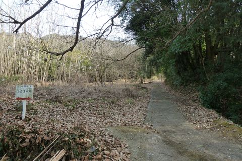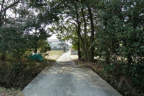 市道走出新賀線から左折し(道路の向かって右に看板あり)、民家の横の細道を南へ50m進む