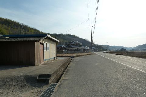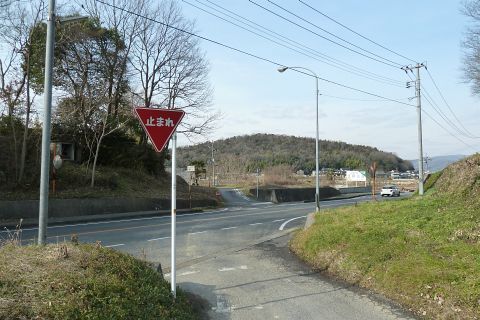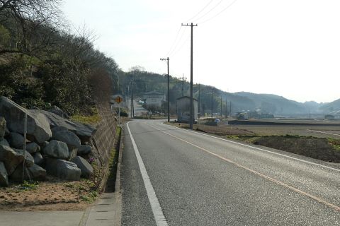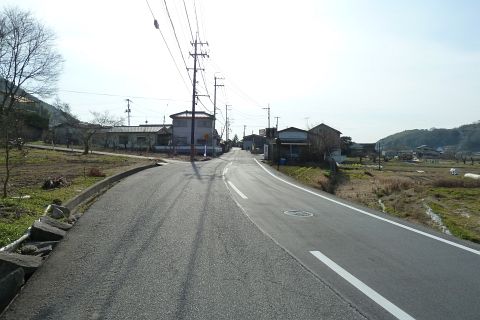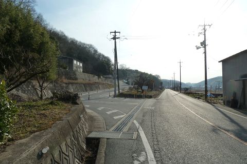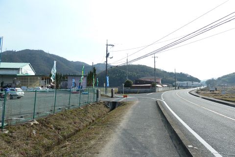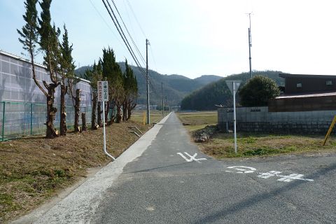 堤防から車道に戻り、西へ50m進み旧県道(バス道)に出る