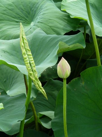 蓮の巻葉(若葉)と未開敷蓮華(みかいふれんげ:蕾の状態の蓮の花)