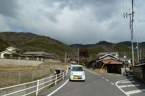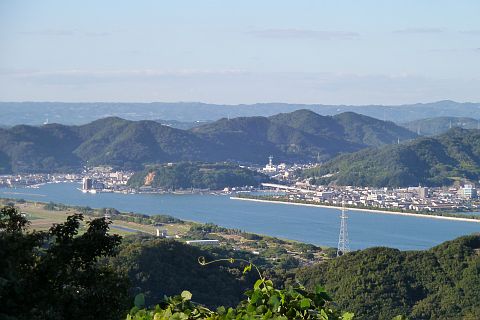 古城山の奥に龍王山(笠岡山、衣笠岡、観音山 175m)、その向かって左に金崎山、