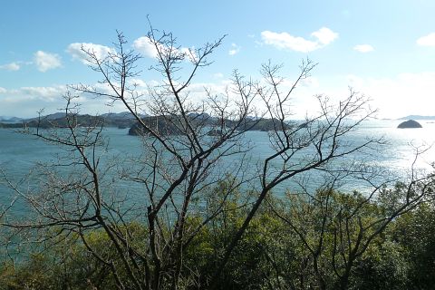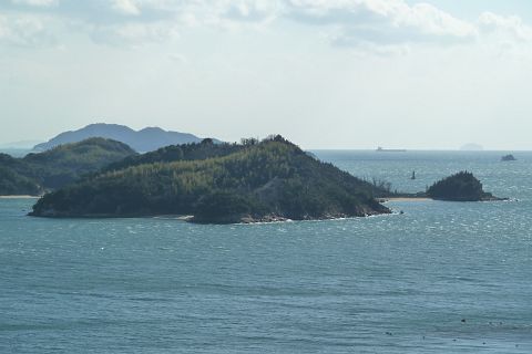 向かって左に手島、廣島、小手島。小手島の奥に四国の讃岐富士が見えている。
