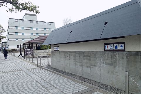 小橋から北北東へ20m進んでトイレの横で右折し、堀跡通りを東へ60m進む
