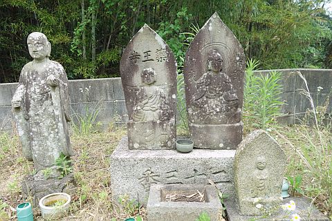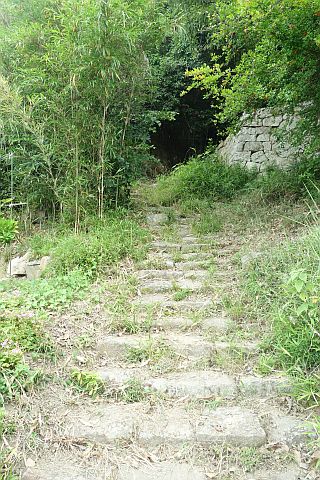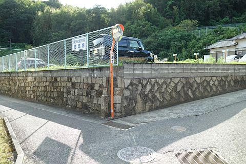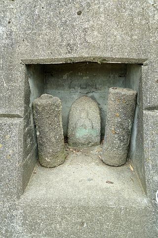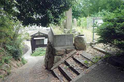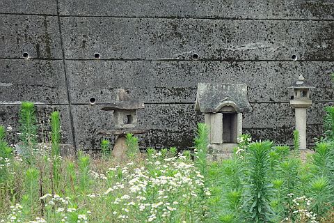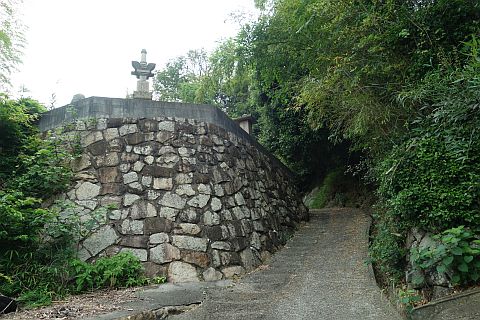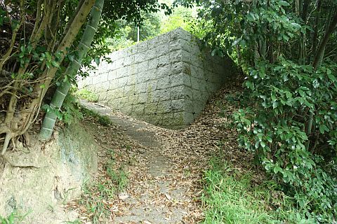 地図上では石垣沿いに南西へ20m程進んだ所にあるが、境内は雑草に覆われていて接近困難。
