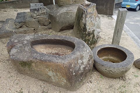 石祠と石燈籠と自然石の燈籠と手水鉢
