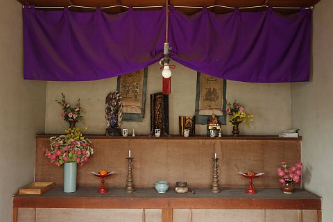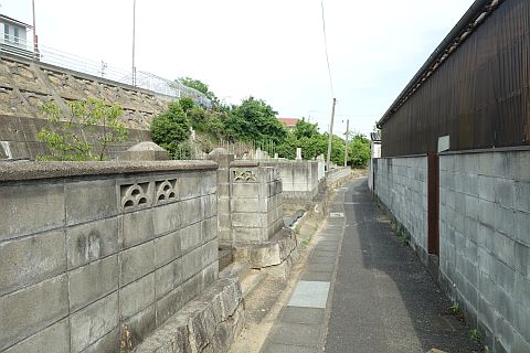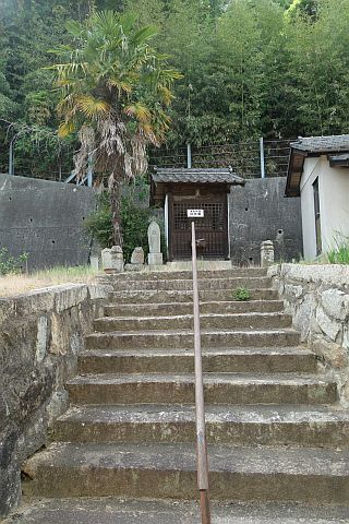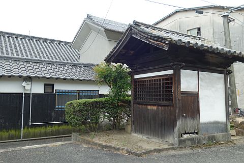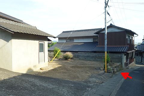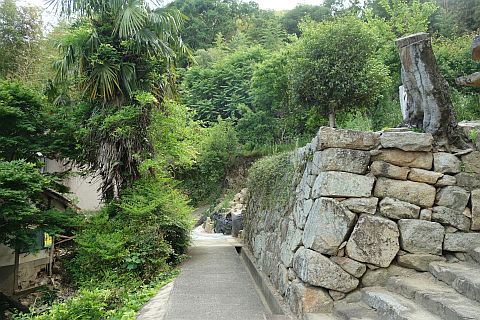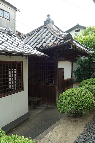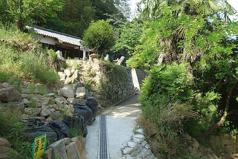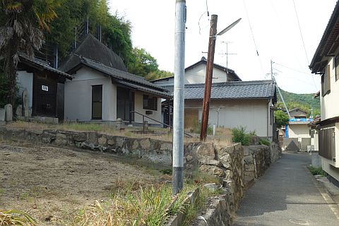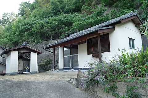 向かって右の道を10m程進んで右折すると善福寺(連島西国8番、連島四国67番札所)がある