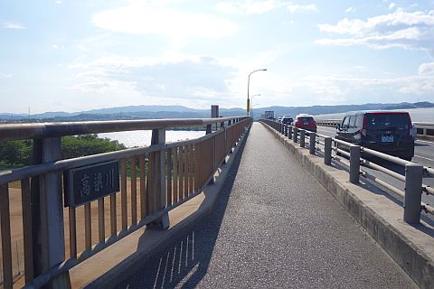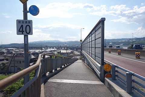 十字路から歩行者自転車専用道を上り、高梁川大橋を渡る