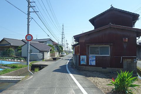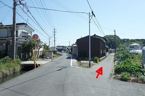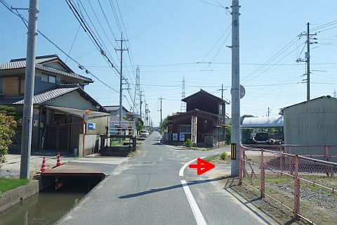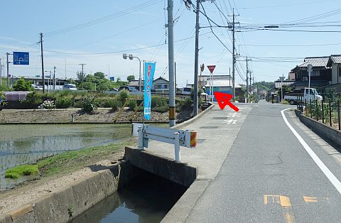 右折して東へ60m進み、排水機場横の十字路を右折して南南西へ220m進む