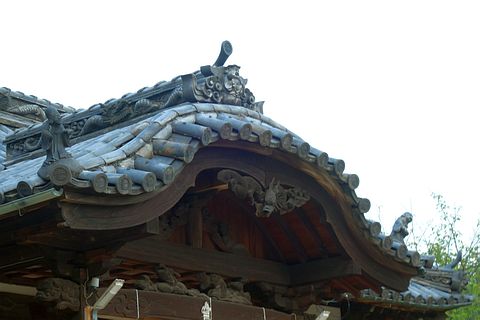 向かって左の巴蓋に福禄寿様、右の巴豚蓋に布袋様。主棟鬼飾りに大黒様。