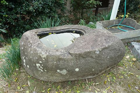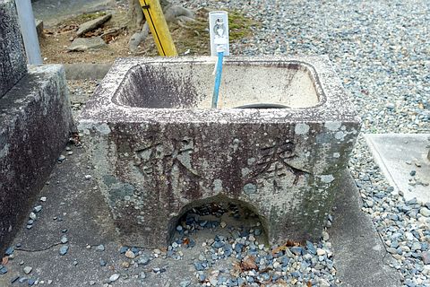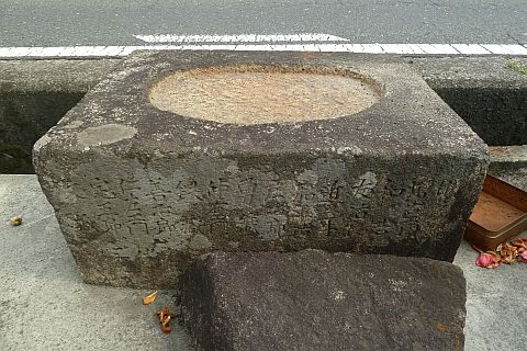 「手水鉢 石壇一切 *真明橋 發起 水口辨造 *㔺話(世話) 磯崎十七吉 黒川磯太郎」