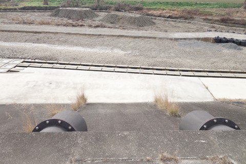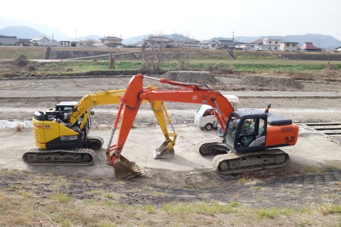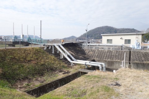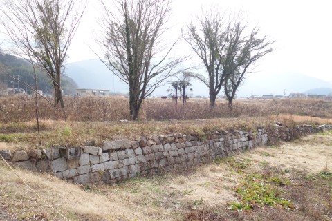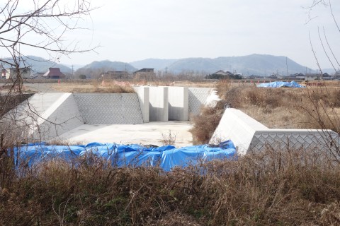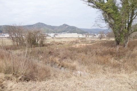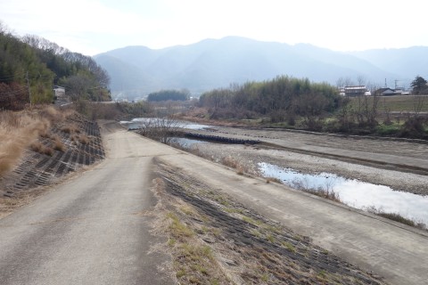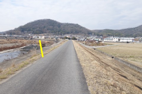 さらに南南東へ130m進んでつきあたりを左折し、小田川の土手道を東南東へ420m進む。