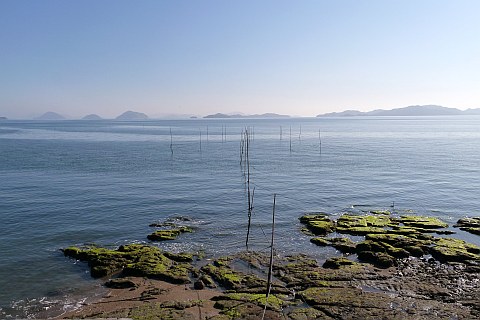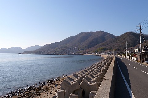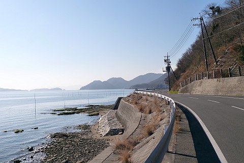 県道47号線を青佐鼻海岸沿いに西へ進み、寄島から大島中へ
