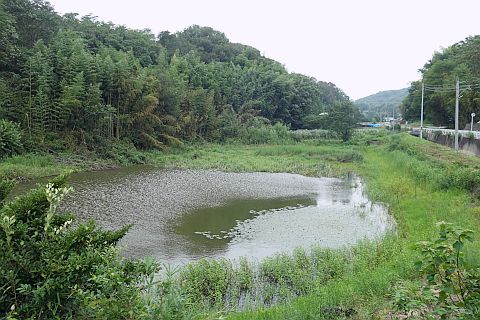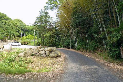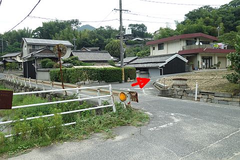 県道を南南東へ45m下り、Y字路を左折して南東へ95m上り、右折して南へ100m上る