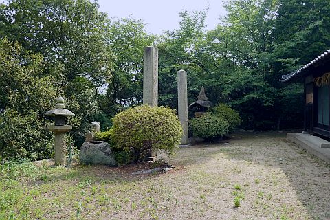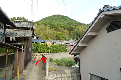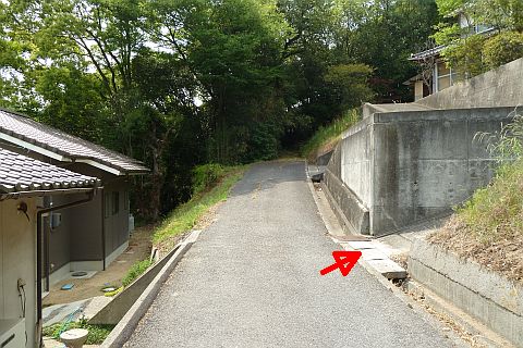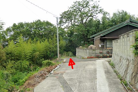 カーブミラーがある所で右折し、墓地への参道を西へ27m進む