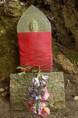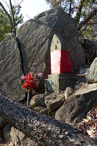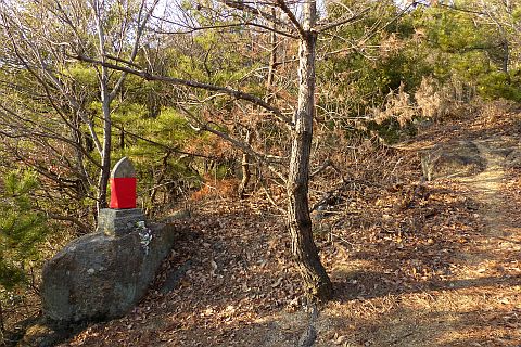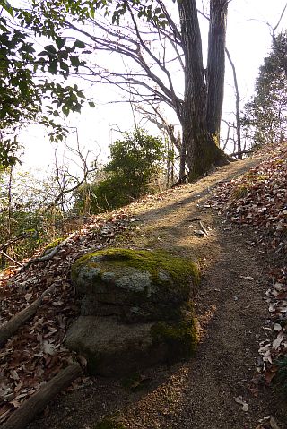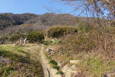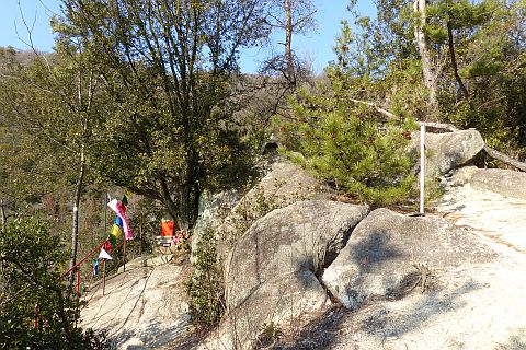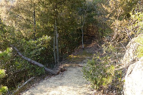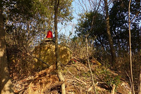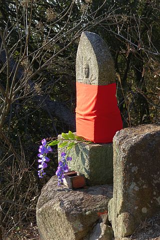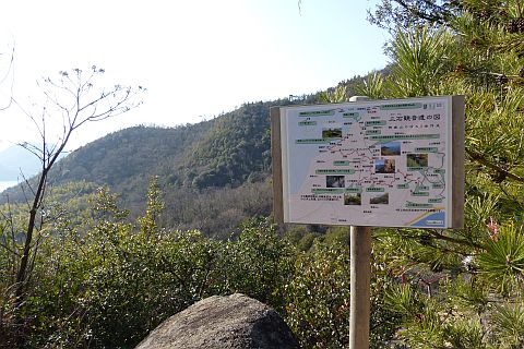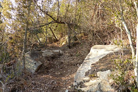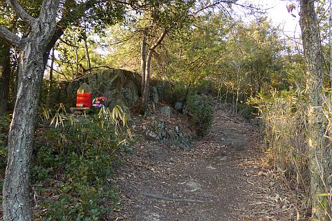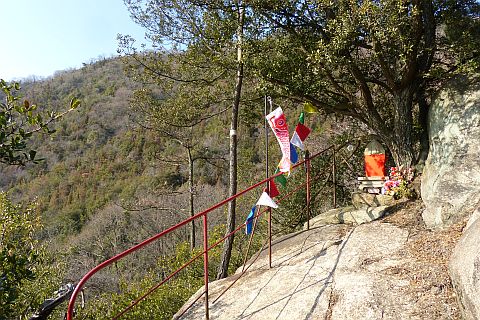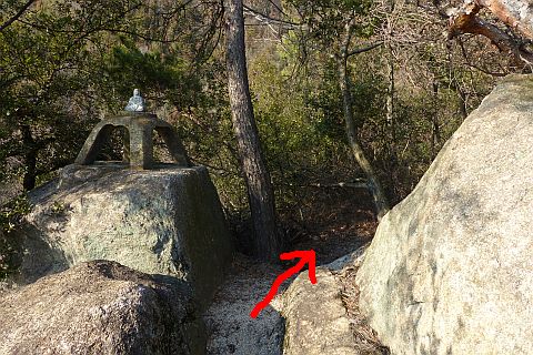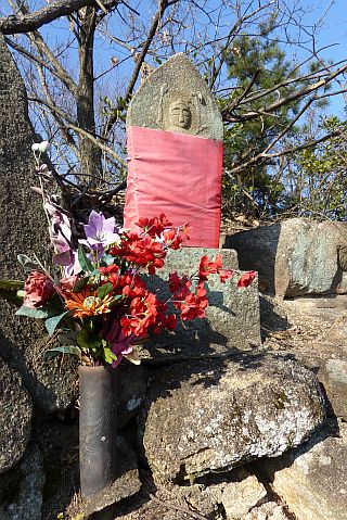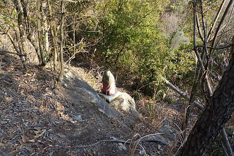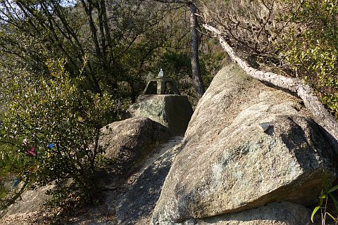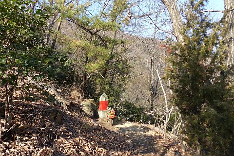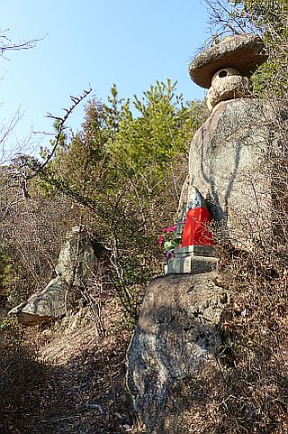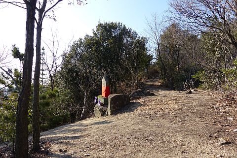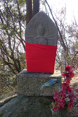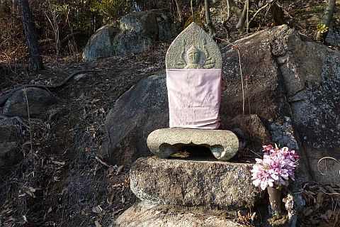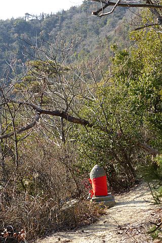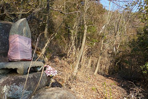 向かって左の道は三石展望地へ向かう。向かって右上に見えているのは西国11番の石仏。