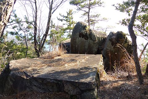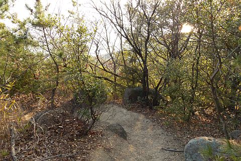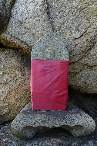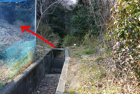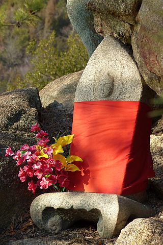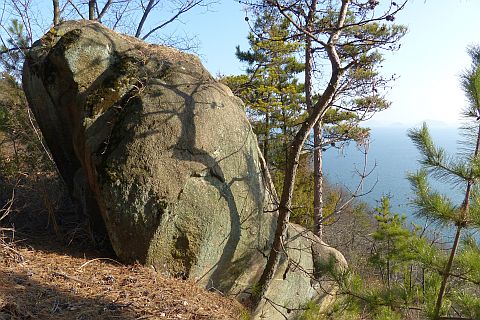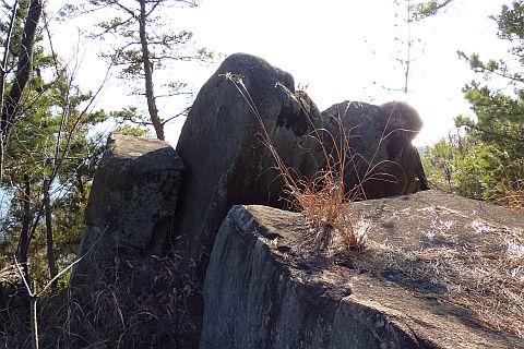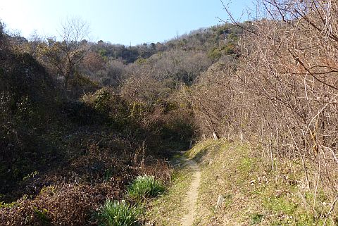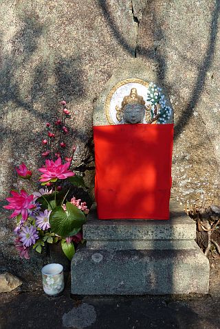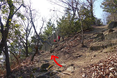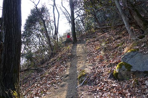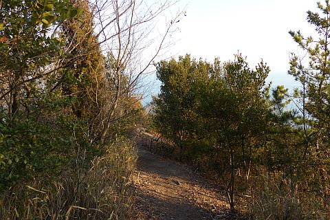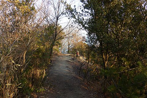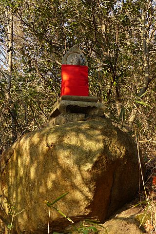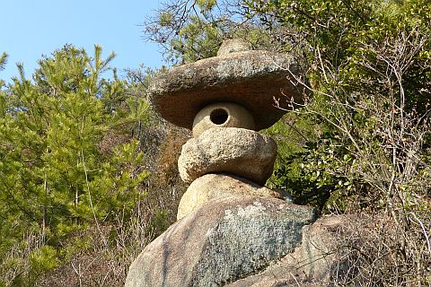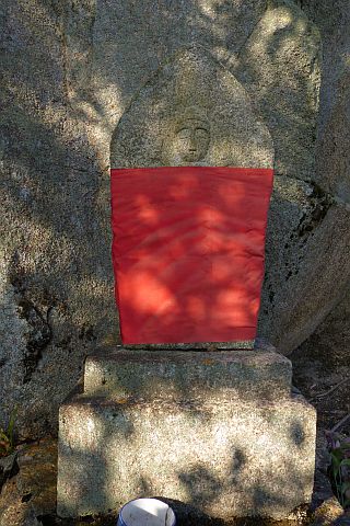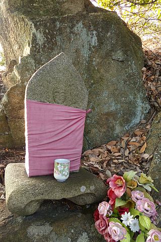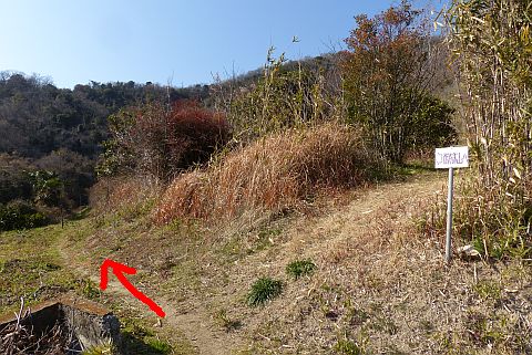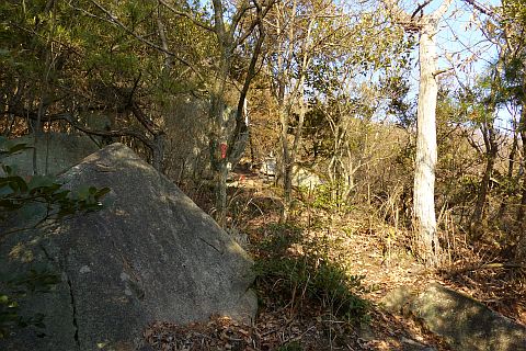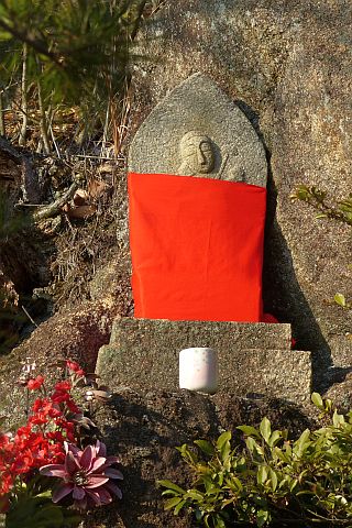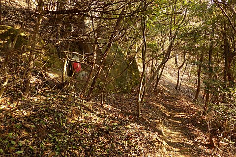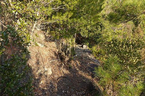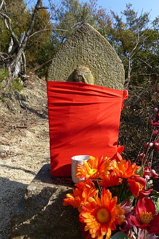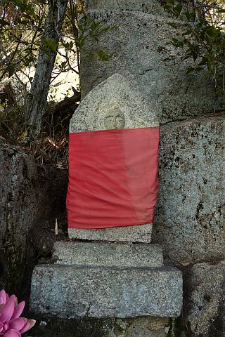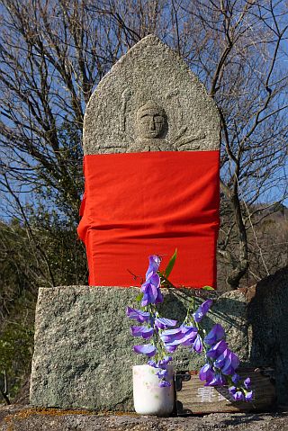 向かって左の道は三石展望地へ向かう。向かって右上に見えているのは西国11番の石仏。