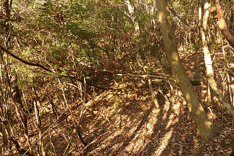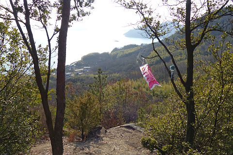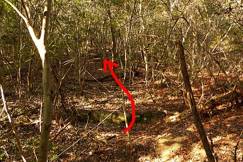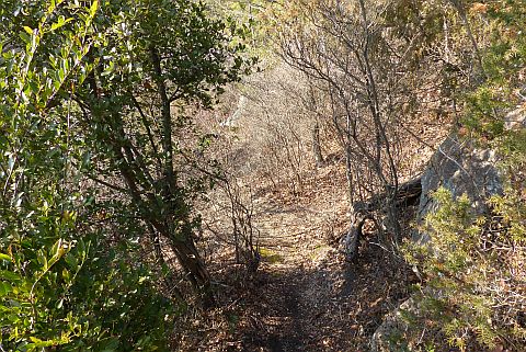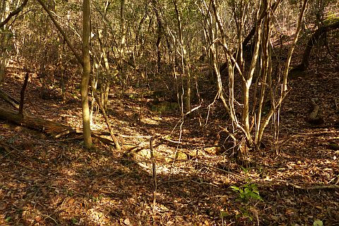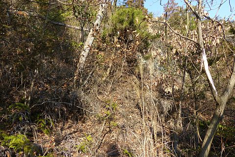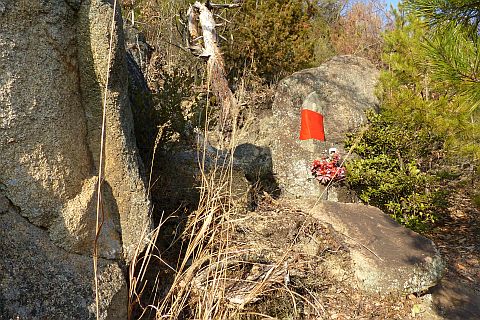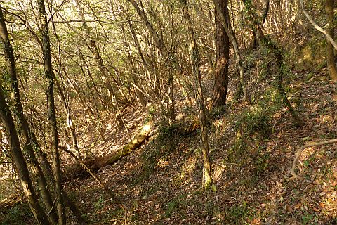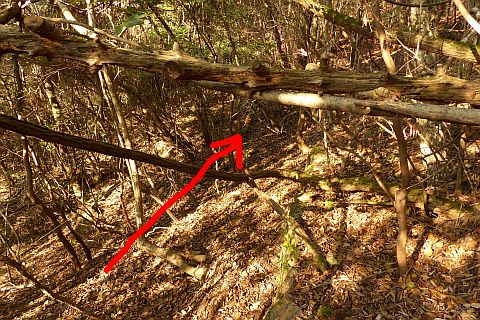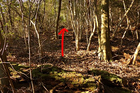 道無き道を北へ登っていく。誘導ロープが所々にあるが、視界は木々に遮られ、