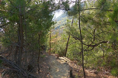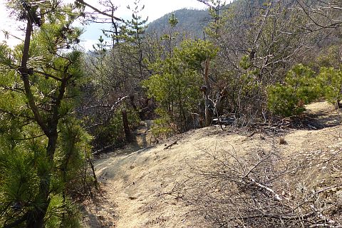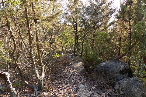 旧大島村四国36番札所前の車道を南南西へ55m進み、丁字路で右折して御嶽山登山道に入る