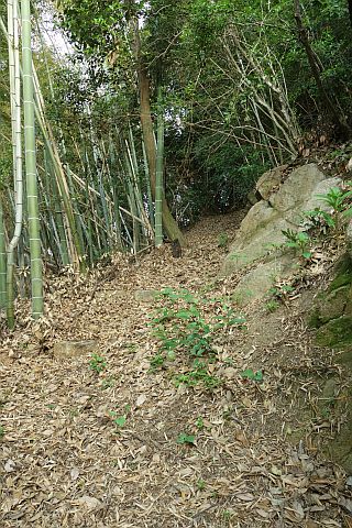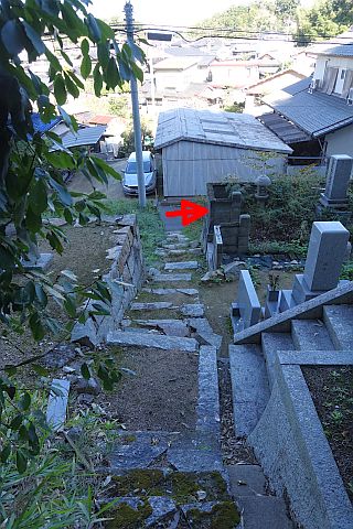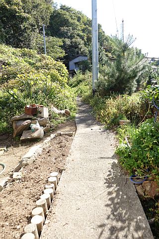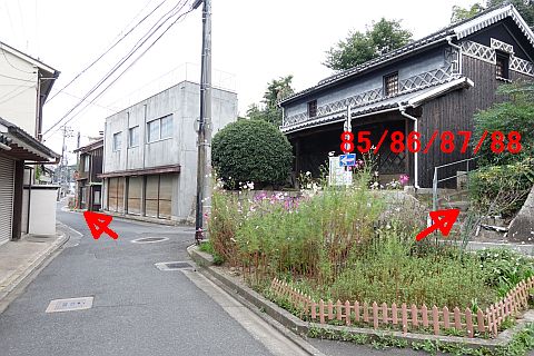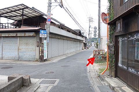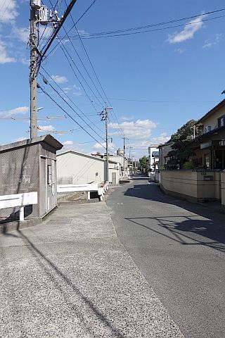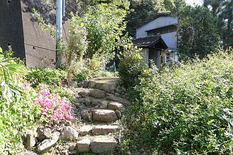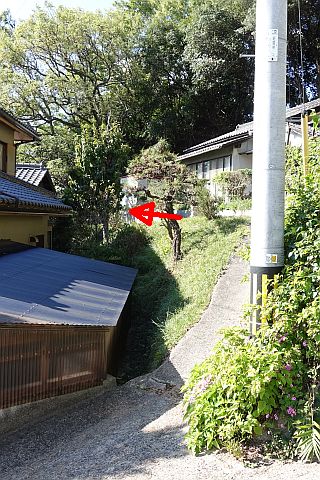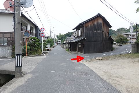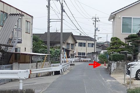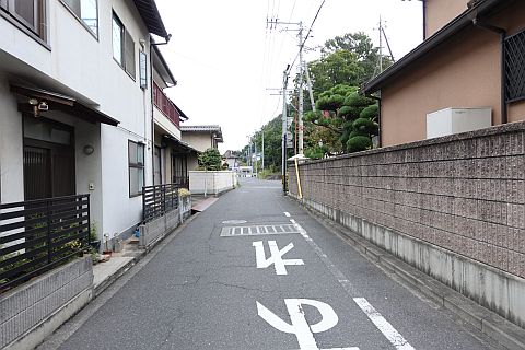西へ15m戻り、丁字路を左折して細道を西南西へ8m、南東へ10m進む