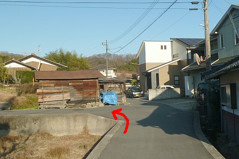 青い屋根の民家の手前で左折