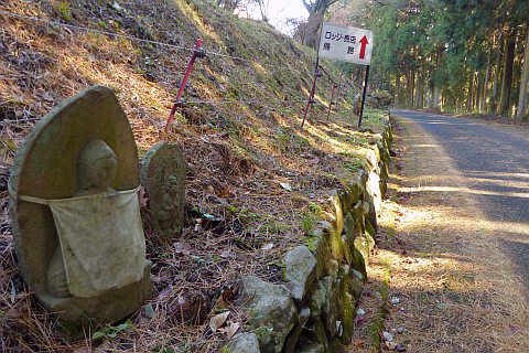 弥高山ロッジの南にある弥高山外周路の丁字路から南へ15m進み、Y字路を南南東(右)へ43m進む