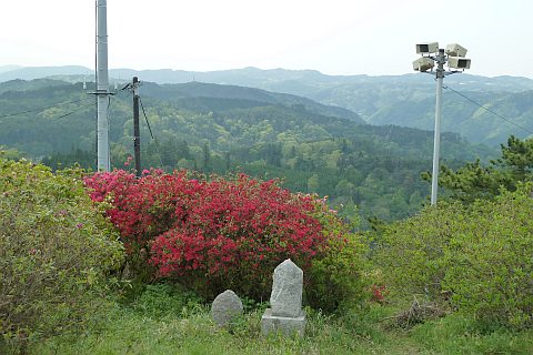 弥高山の東北東3kmの所にある(電線路の後ろに見えている二等辺三角形の山)。