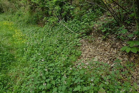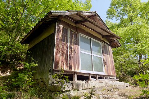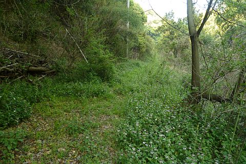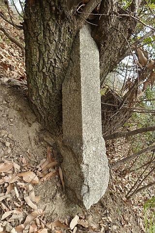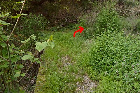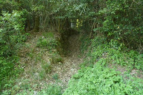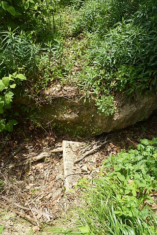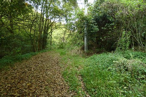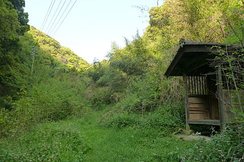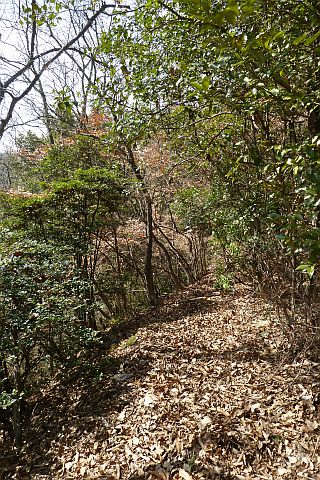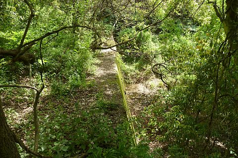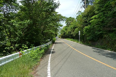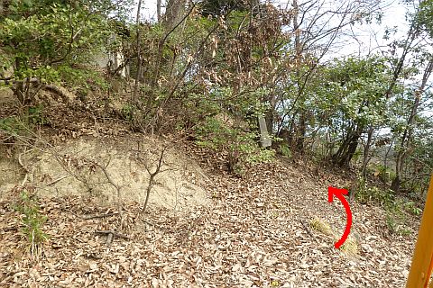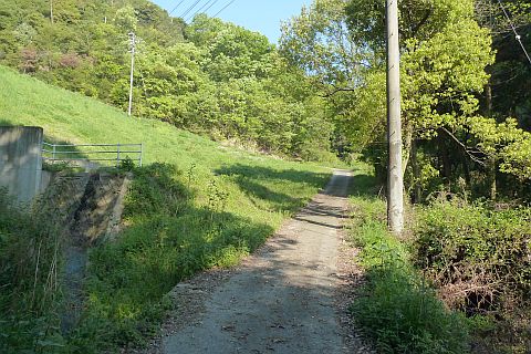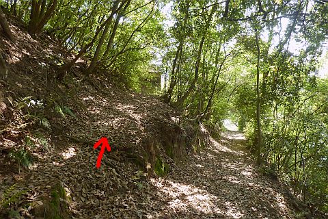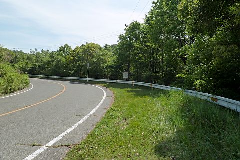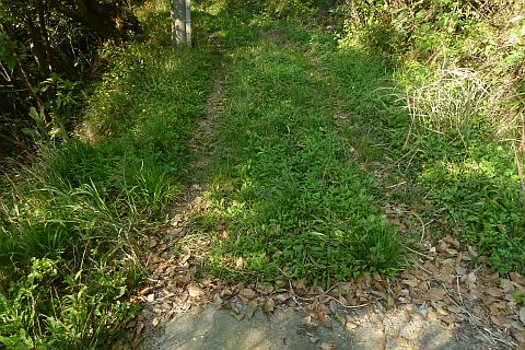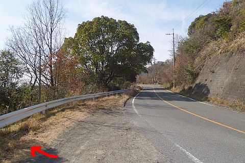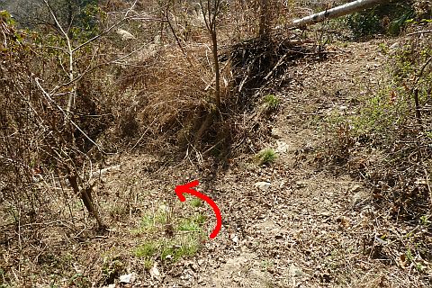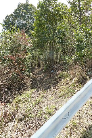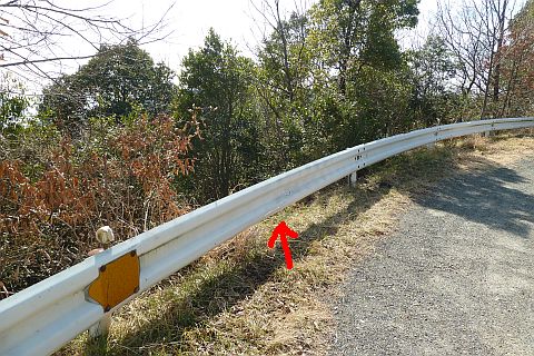 右折して道路脇の退避所からガードレールを跨いで山道に下る