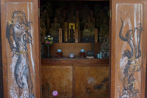 堂内中央に善光寺式阿弥陀三尊像と法燈圓明國師(心地覚心)大和尚坐像が、