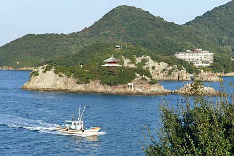 正面に玉津島、向かって右に淀媛神社