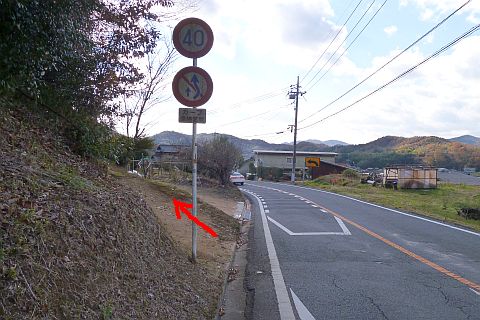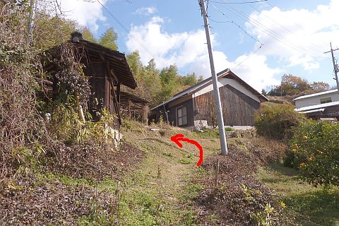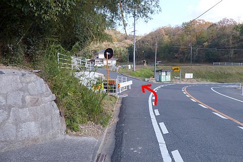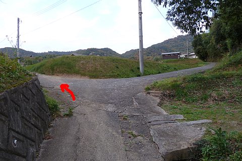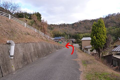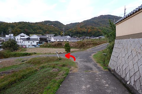 細道を西へ113m進み、丁字路を右折。北北東へ42m上る。