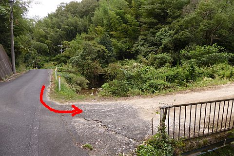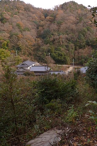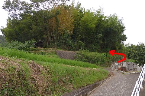 観音堂の前から山際の細道を北東へ123m進み、かも川手延素麺(株)の南から