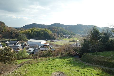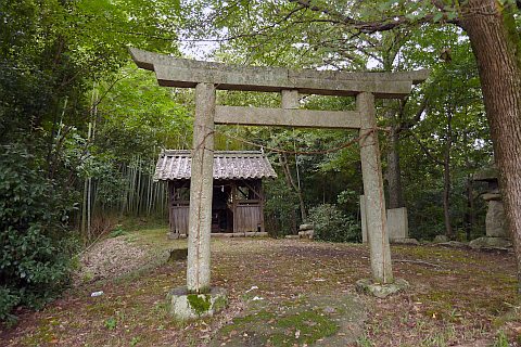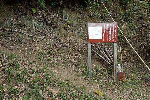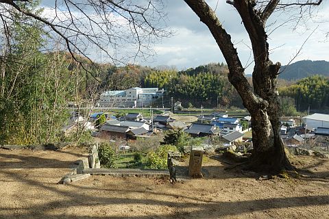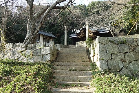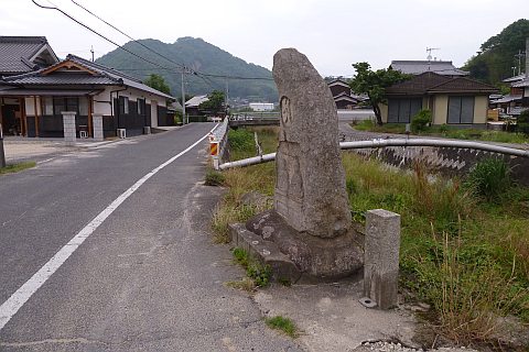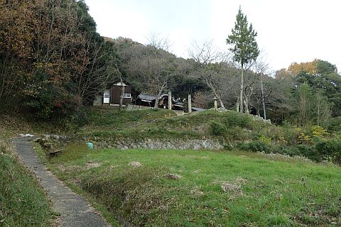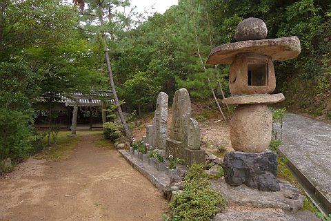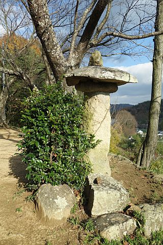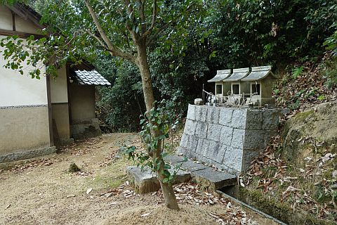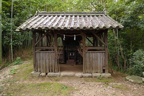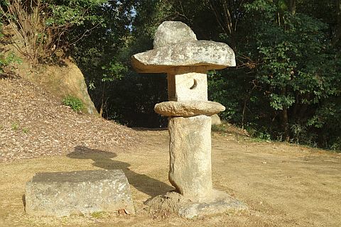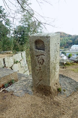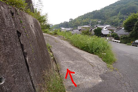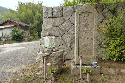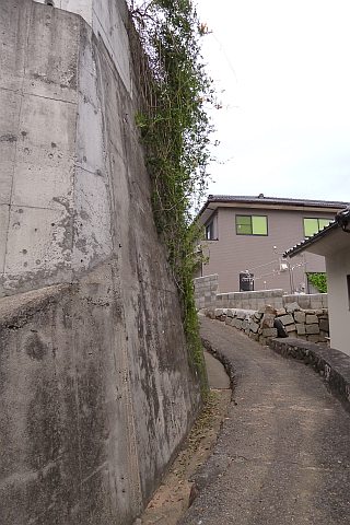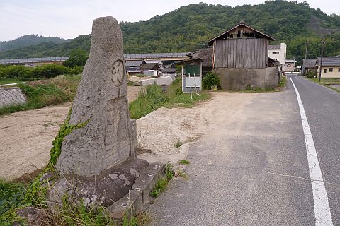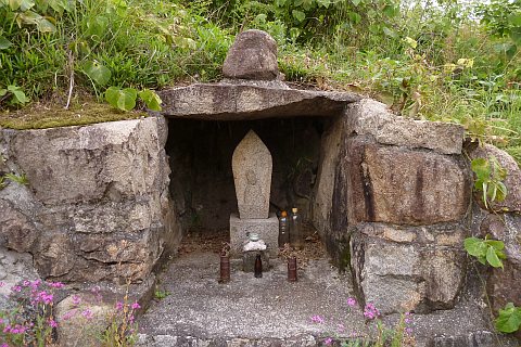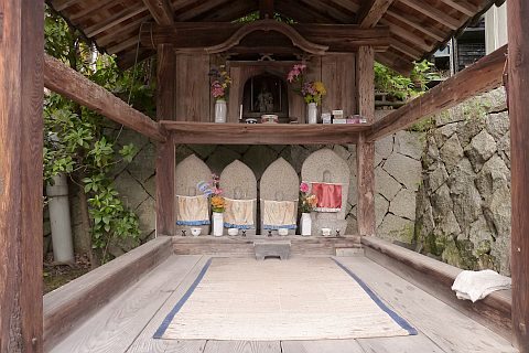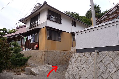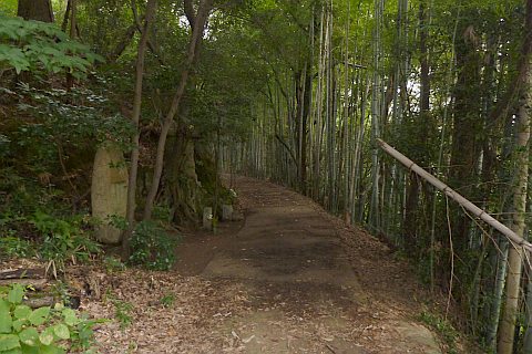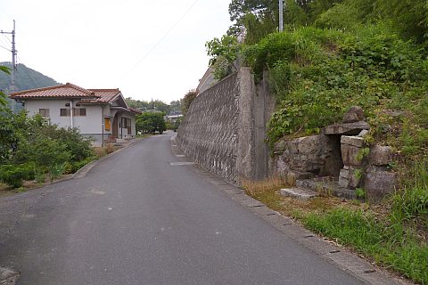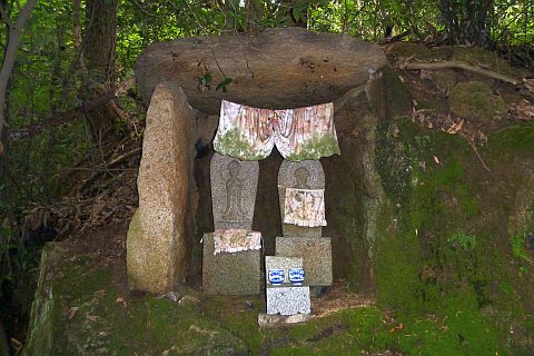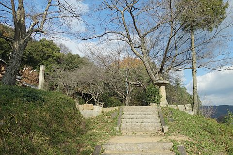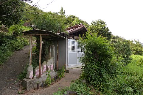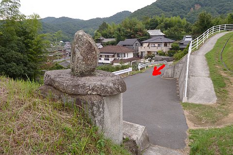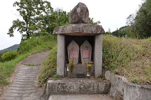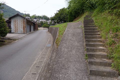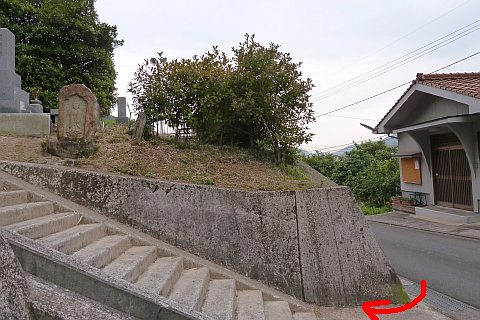 76番札所前の丁字路から墓地への参道を東へ56m上り、折して南へ48m上る。