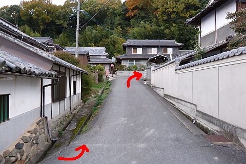 燈籠の前の丁字路を左(北)へ64m上り右折。東へ86m上る。
